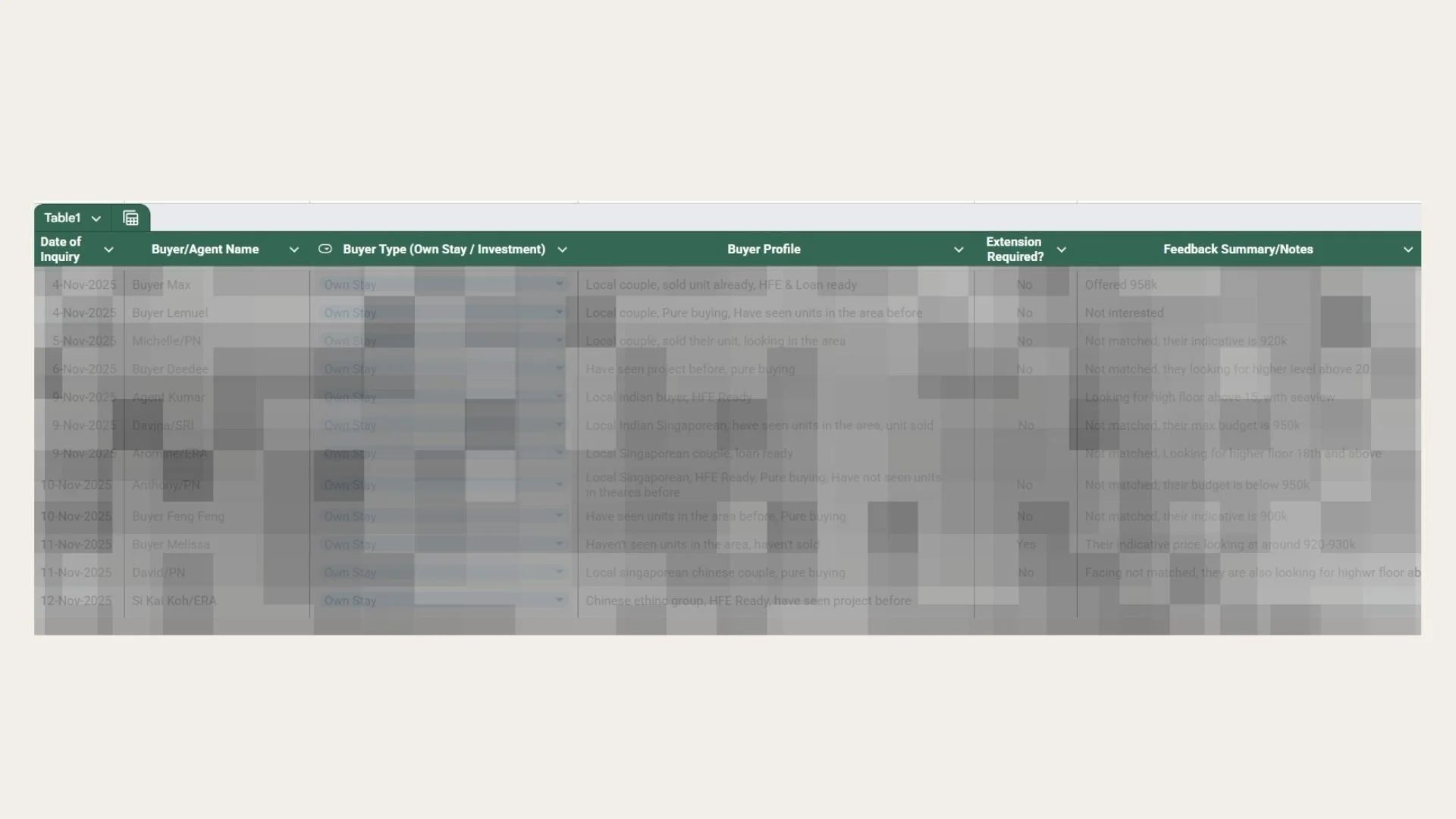 Every viewing timestamped. Buyer profile, agent name, duration, follow-up status. Concerns, price sensitivity, offer likelihood — documented after every viewing.