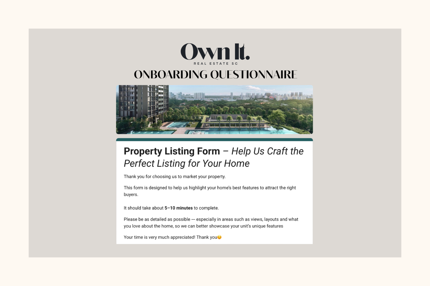 Before a single listing goes live, take the time to understand your property the way only an owner can. The onboarding questionnaire captures your property's unique selling points — renovation details, features, aspects you've valued living there — and aligns them with your personal timeline and selling goals. This onboarding questionnaire will later be turned into a strategic brief that shapes your CMA, your marketing strategy, and every buyer conversation that follows.